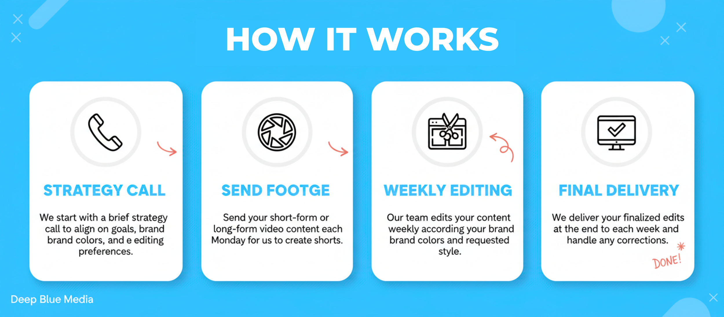 We take care of everything — strategy, scripting, editing, posting, and growth. You only need to show up to film, and for most of our clients that’s about 3-4 hours a month. That’s it.